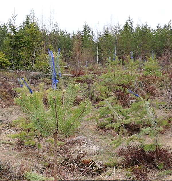 Erityisesti hirvien talvilaidunnusalueiden taimikot kannattaa käsitellä syönninestoaineella. Taimiin voi laittaa myös latvasuojat. Kuva: Arto Pulkkinen